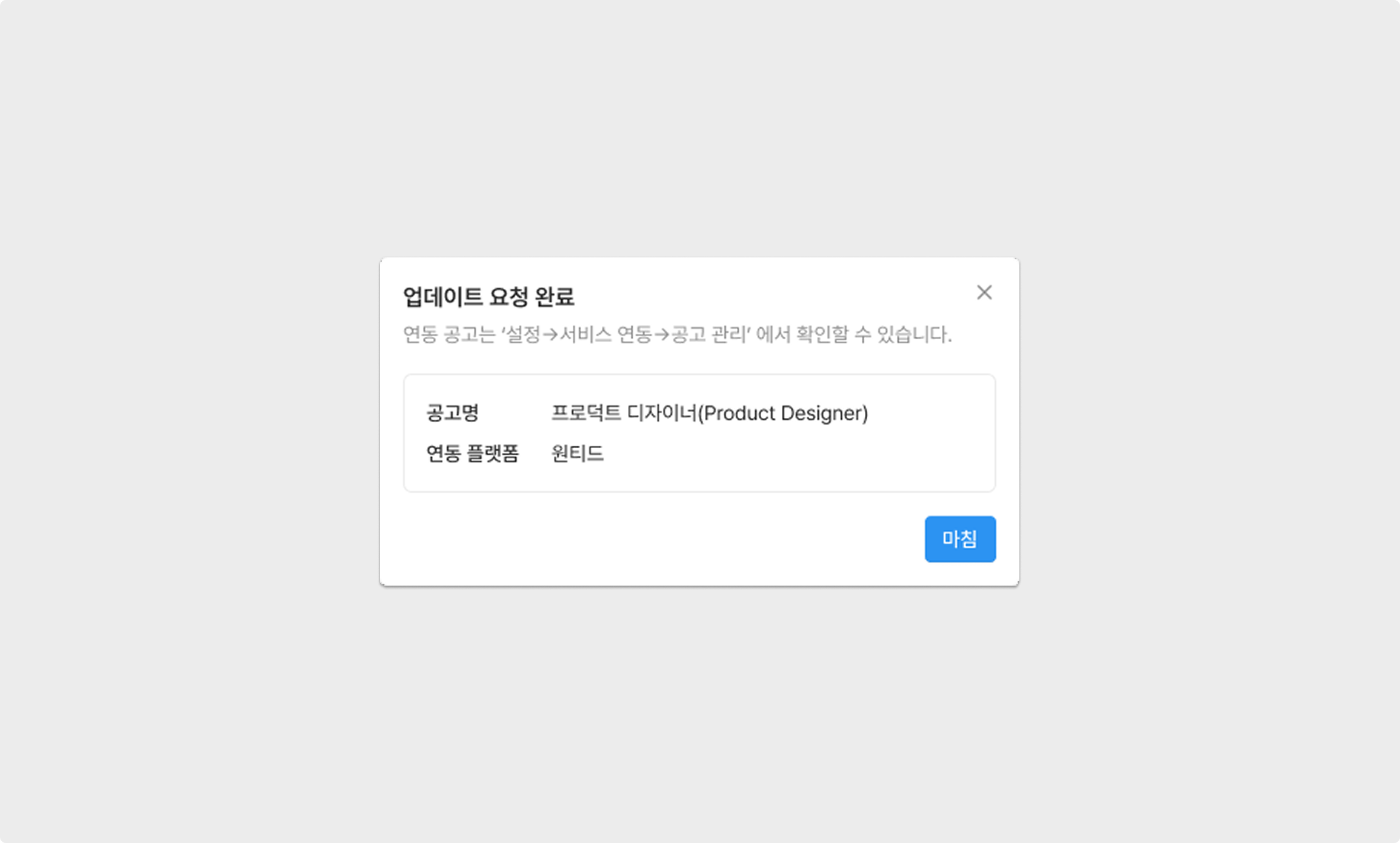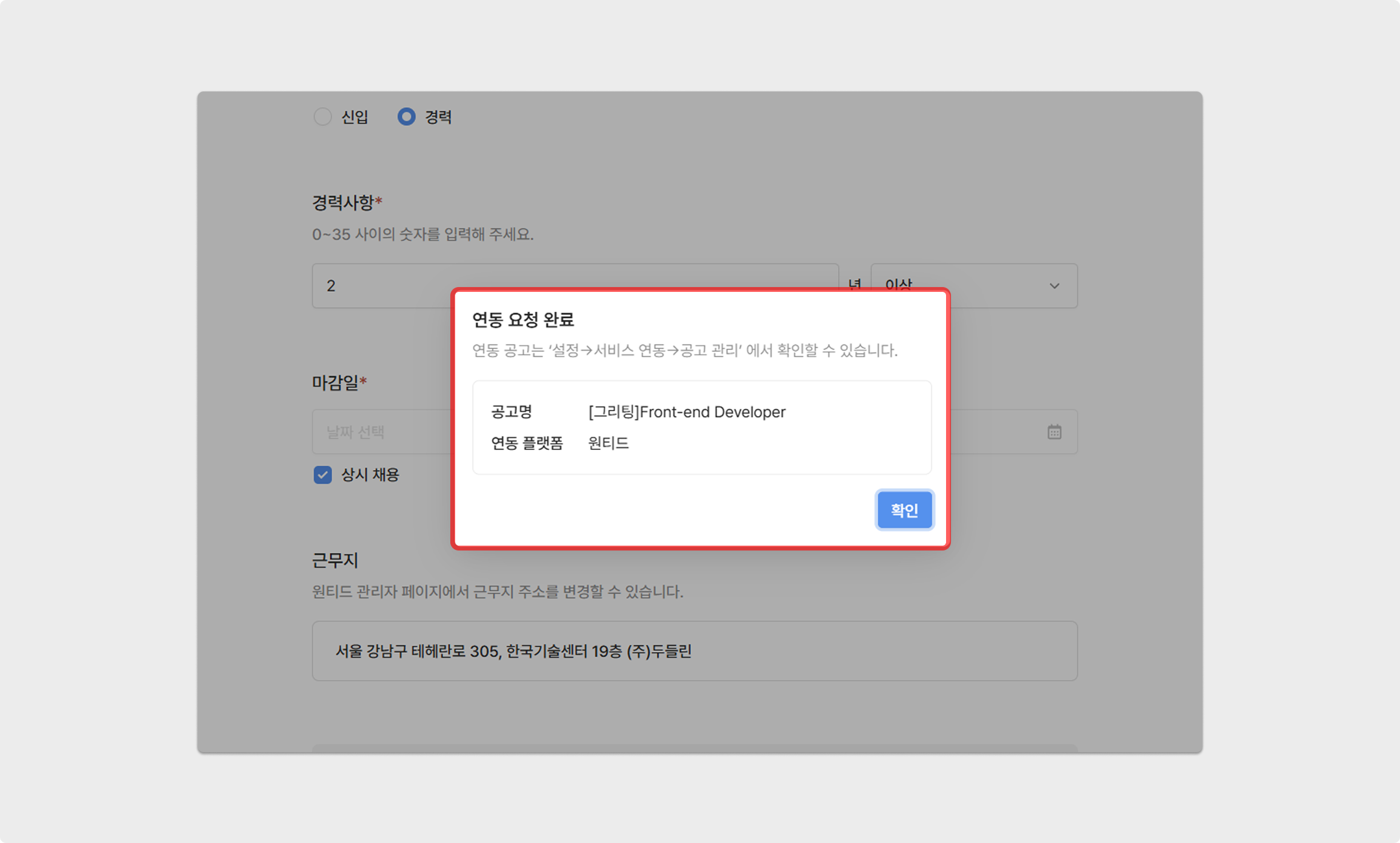 공고를 연동하는 과정에서 해당 버튼을 클릭해 연동을 완료할 수 있습니다.