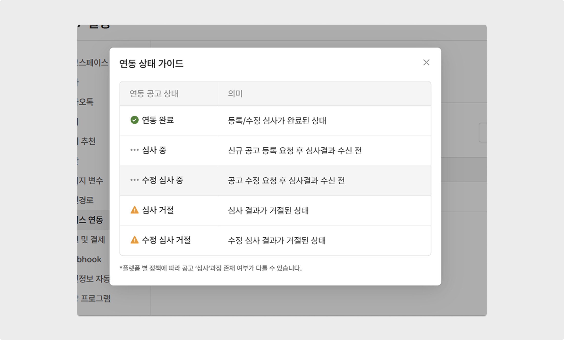 공고 연동은 심사 중 / 수정 심사 중 / 심사 거절 / 수정 심사 거절 / 연동 완료 로 나뉩니다.