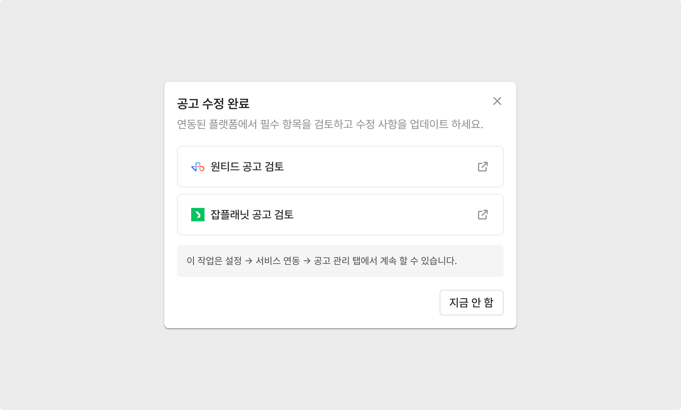그리팅에서 연동된 공고를 수정할 시, 수정 사항을 플랫폼의 공고에도 반영할 수 있습니다.