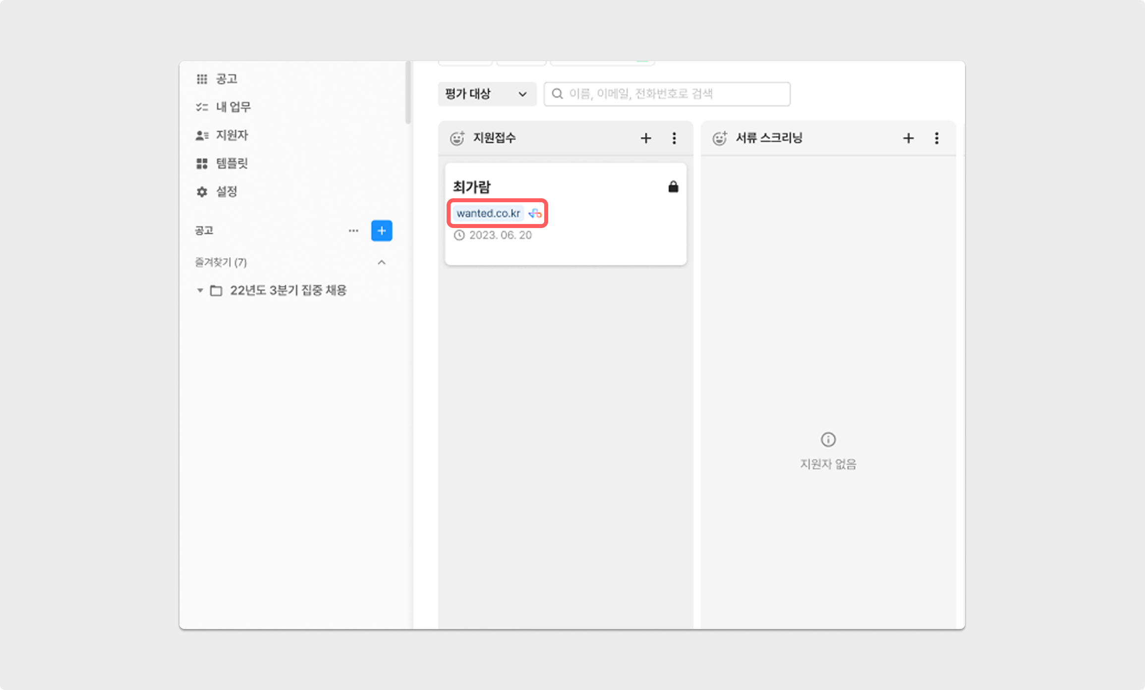 연동된 원티드 공고에 지원자가 등록되면, 그리팅에도 지원자 정보가 자동으로 등록됩니다. 이때의 지원자는 그리팅에서 편리하게 관리할 수 있습니다.