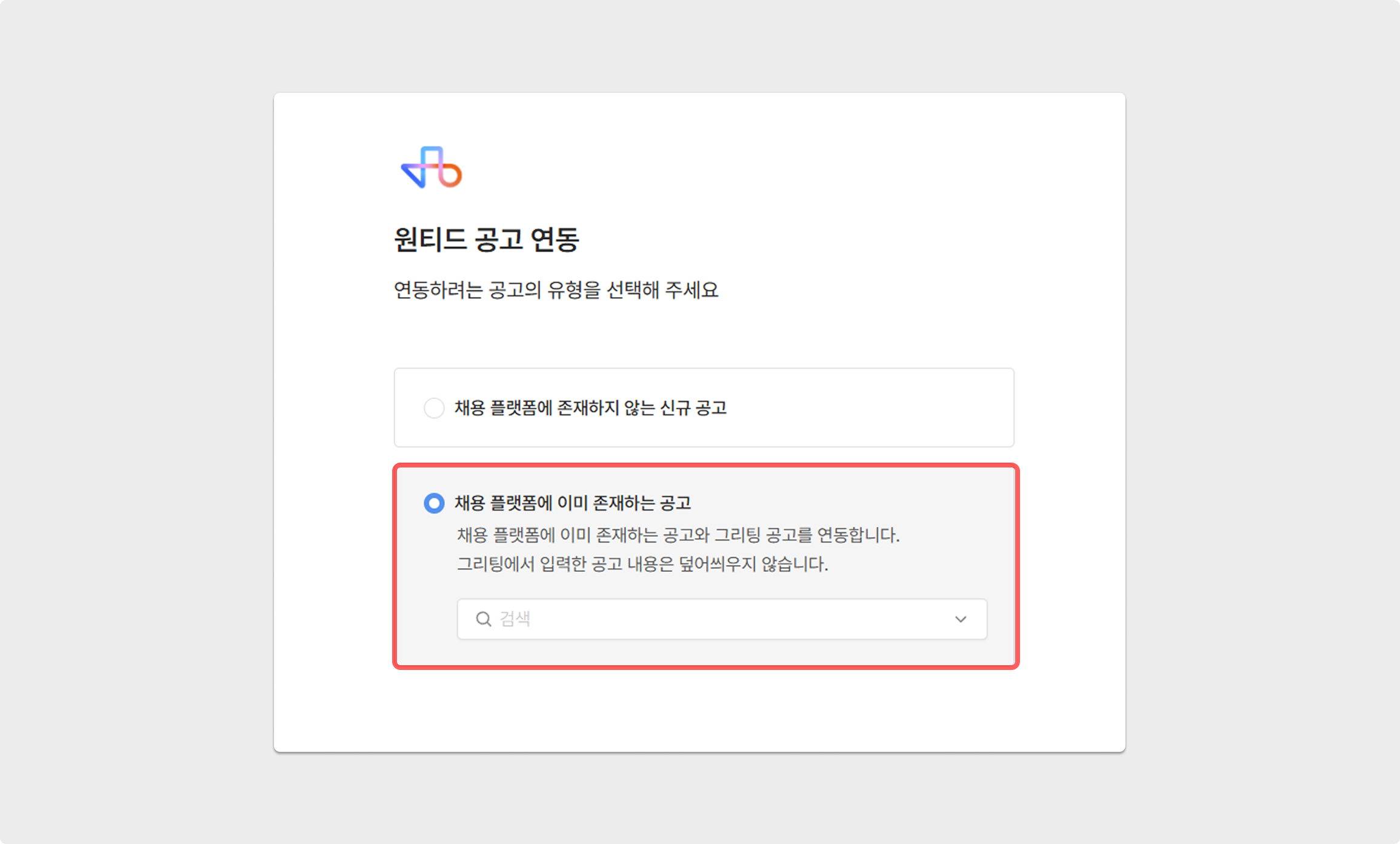 원티드 내 기존 공고와 연동하기 위해, [채용 플랫폼에 이미 존재하는 공고] 버튼을 클릭해 주세요.