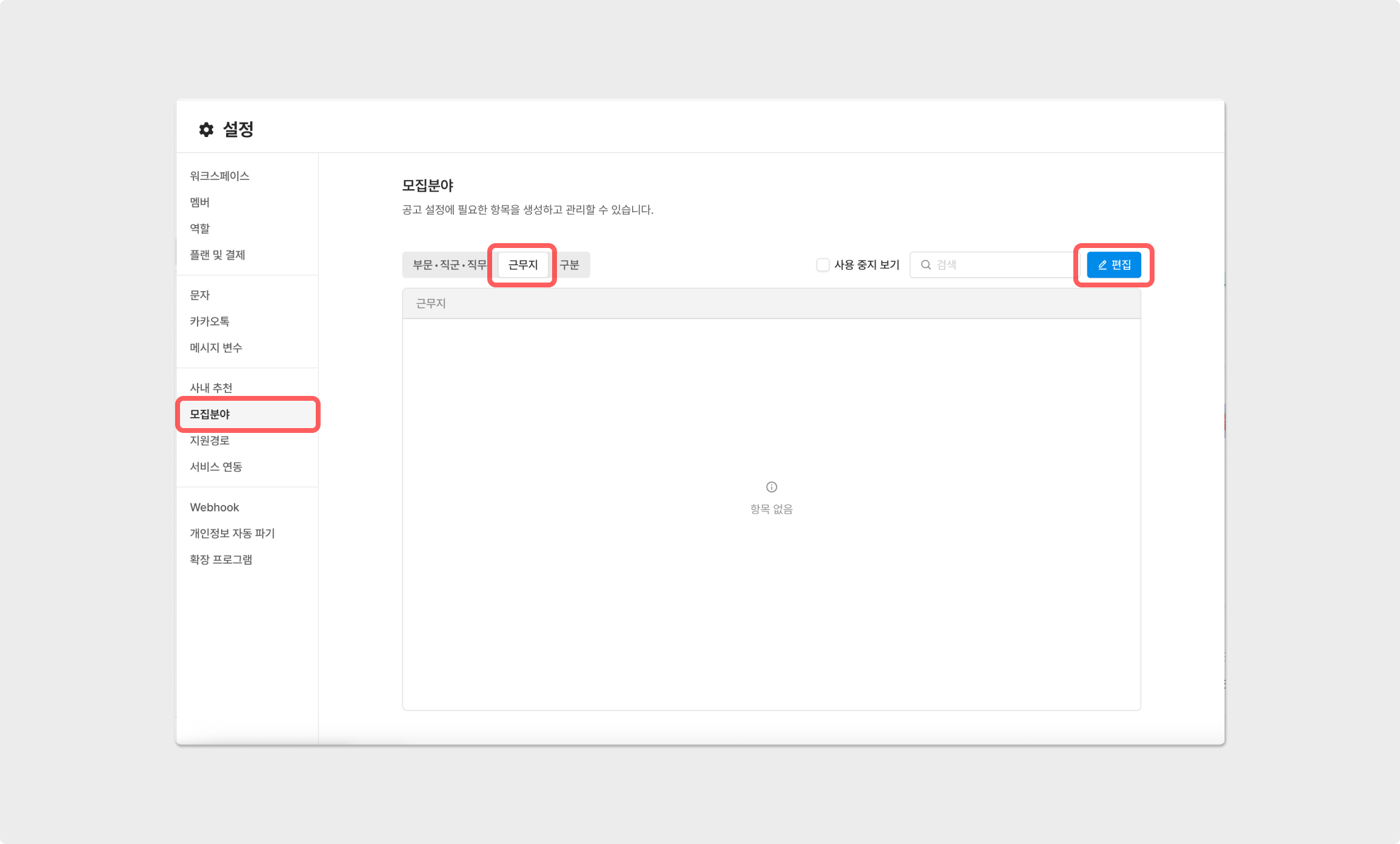 워크스페이스 설정 → 모집분야 → 근무지 탭 → 파란색 [편집] 버튼 클릭