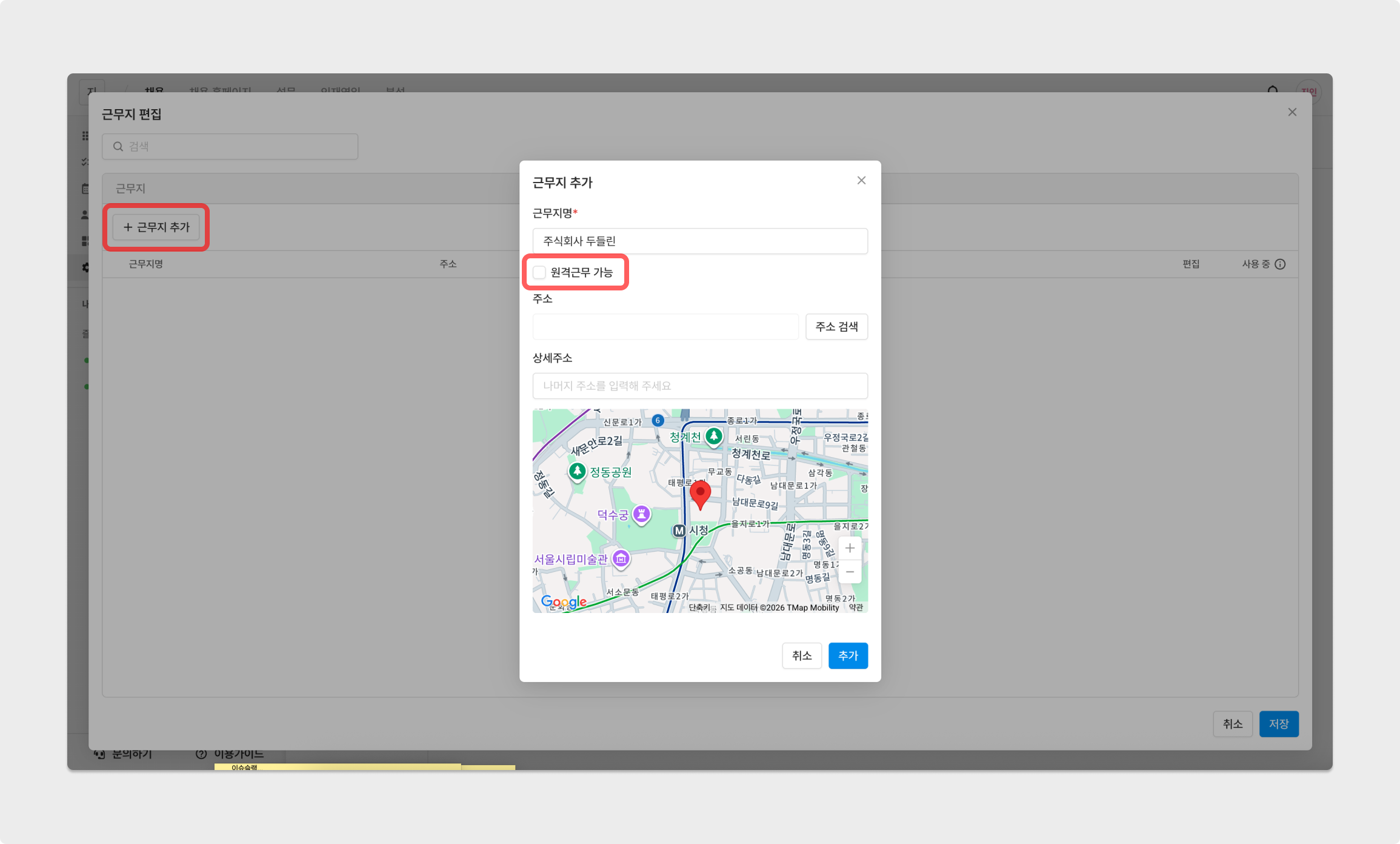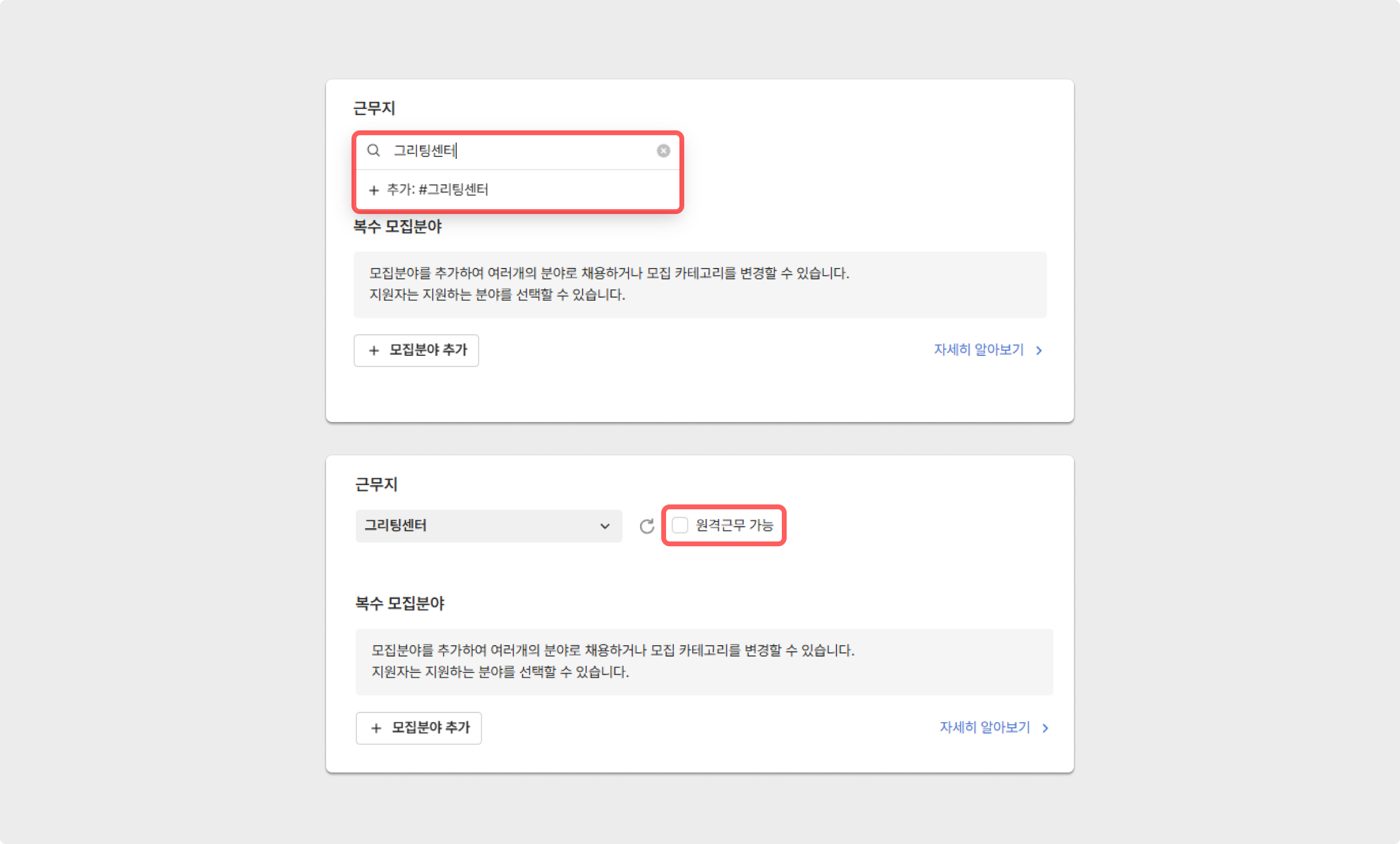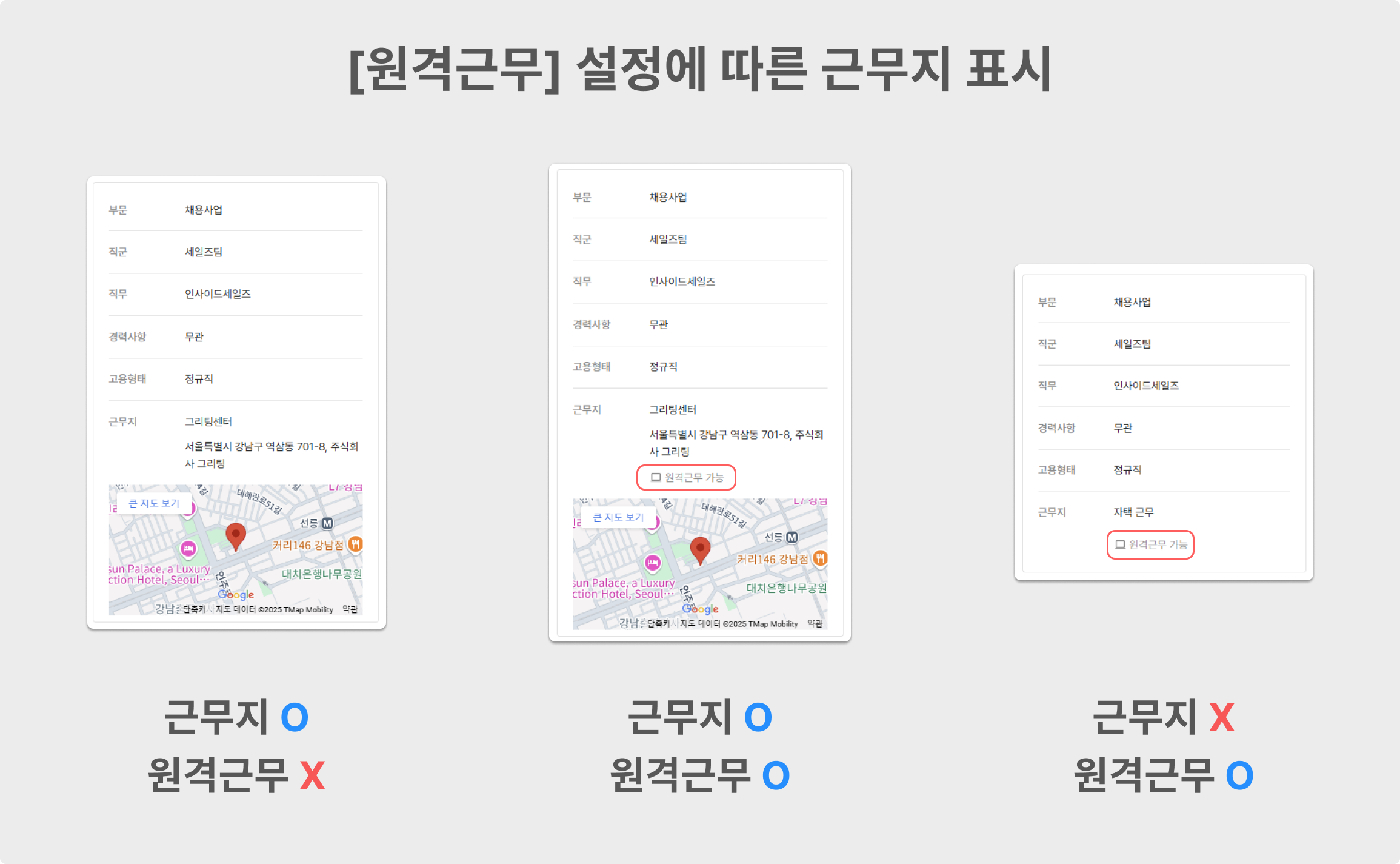 근무지 추가를 통해 Google 지도에 등록된 주소를 근무지로 설정하여 지원자에게 지도를 제공할 수 있으며, 우측 원격근무 가능 버튼을 통해 근무형태를 명시할 수 있습니다.