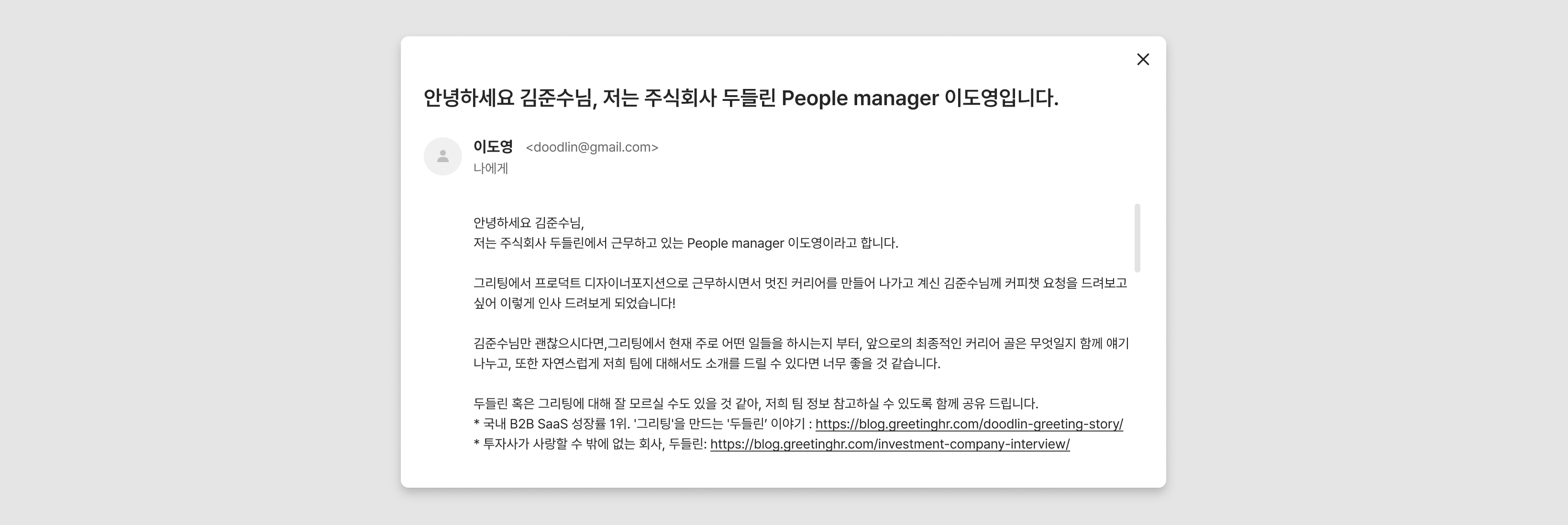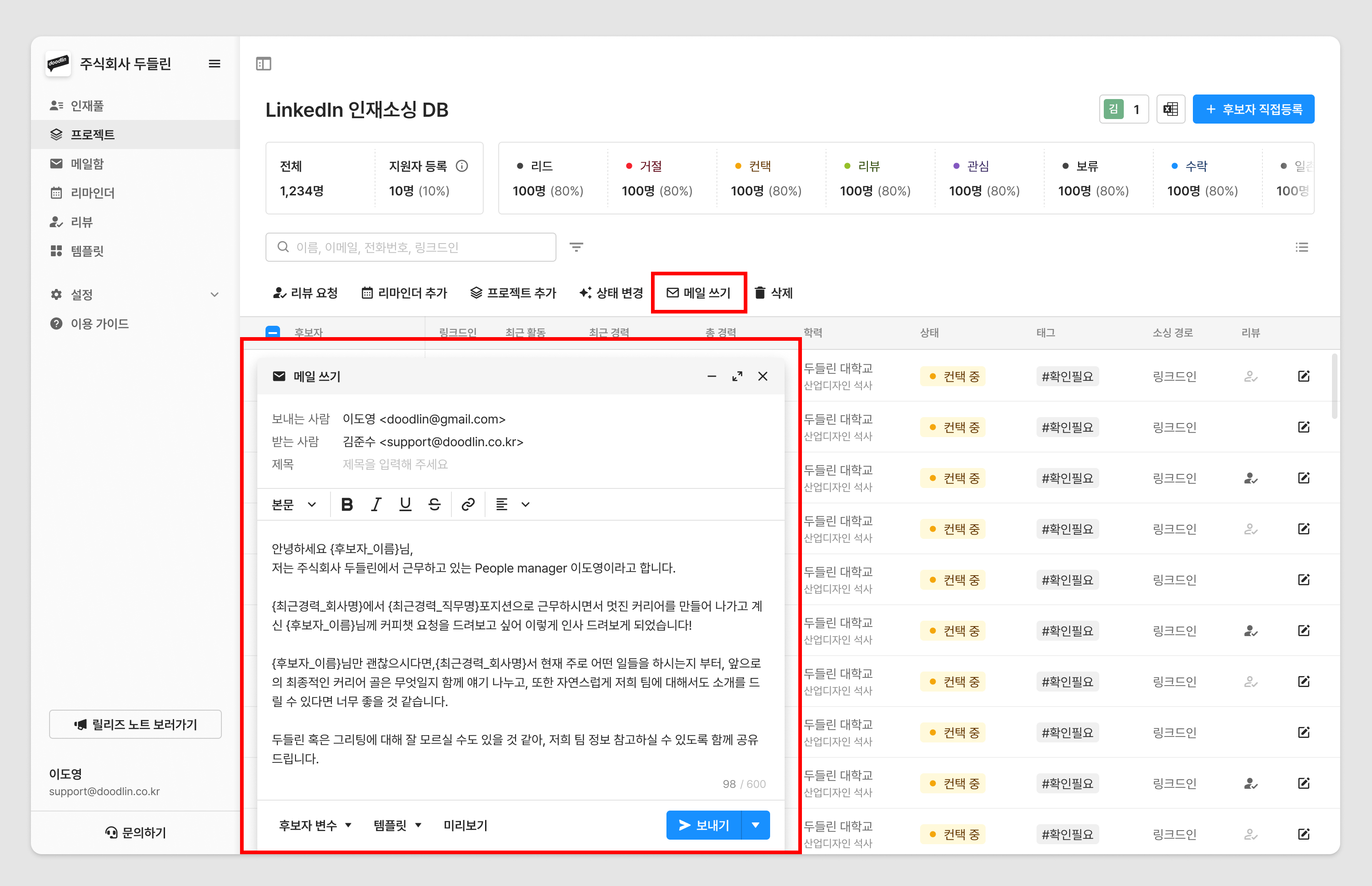 Gmail 메일 연동을 완료하셨다면, 그리팅 TRM에서 바로 후보자에게 메일 전송이 가능합니다.