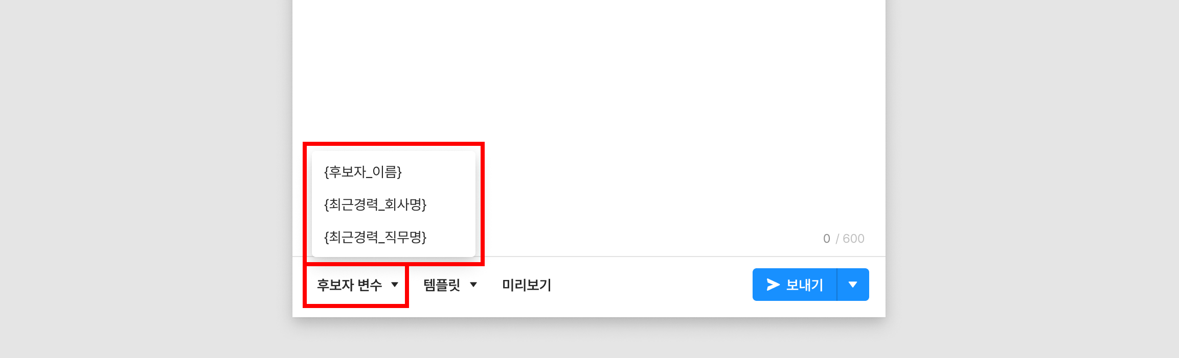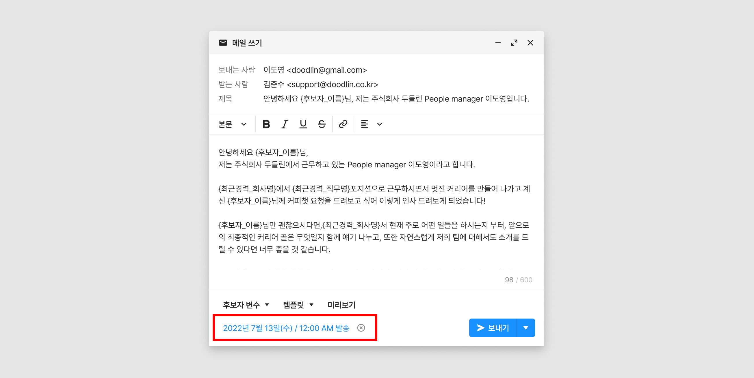 변수 입력 시 후보자에게 저장된 정보를 변환하여 메일을 보낼 수 있습니다.