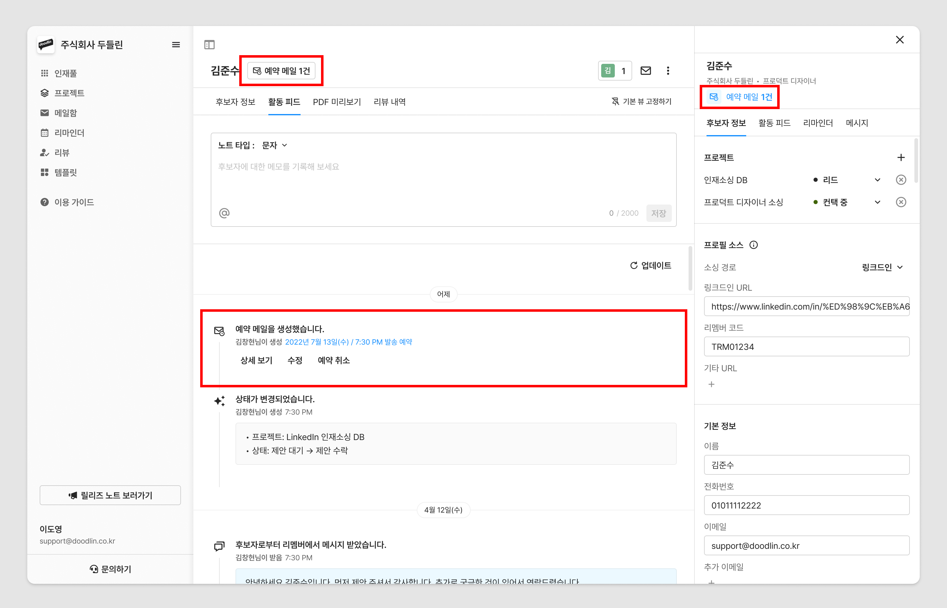 후보자 상세 화면 - 예약 메일 표시